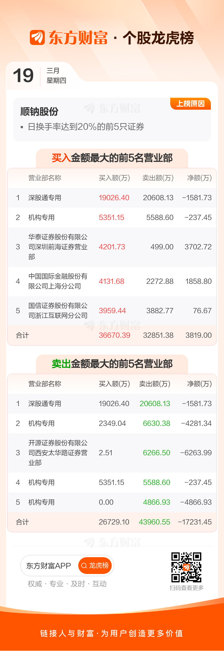交易所2026年3月19日公布的交易公开信息显示,顺钠股份因成为日换手率达到20%的前5只证券上榜。顺钠股份当日收报18.58元,涨跌幅-5.92%,偏离值29.33%,换手率29.33%,成交额38.87亿。