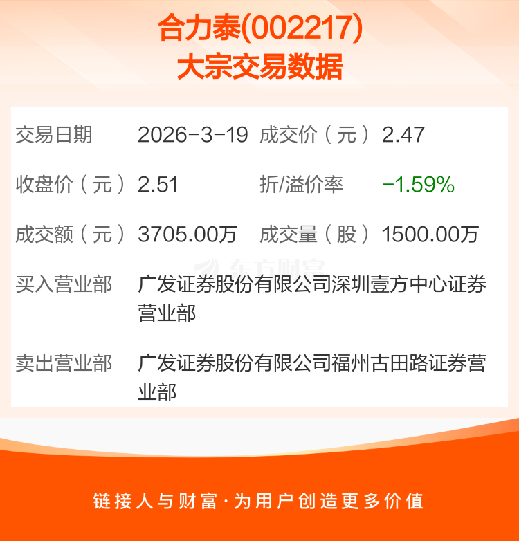 2026年3月19日,合力泰发生1笔大宗交易,共成交1500.00万股,成交金额3705.00万元,占其流通市值比例为0.20%。