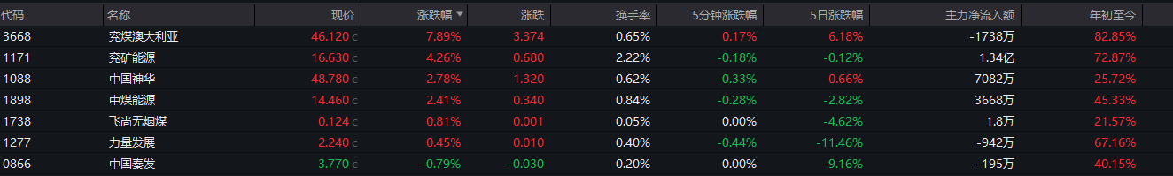 煤炭板块上涨,兖煤澳大利亚涨近8%,兖矿能源涨超4%,中国神华涨超2%。