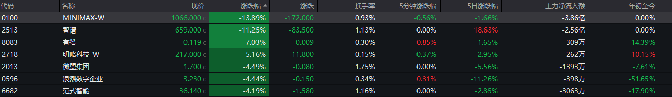 GEO板块走弱,MINIMAX-W跌近14%,智谱跌超11%,有赞跌超7%。