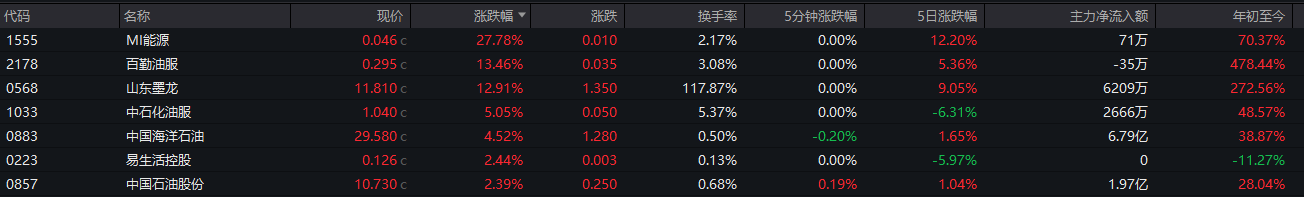 页岩气板块走高,MI能源涨近28%,百勤油服涨超13%,山东墨龙涨近13%。