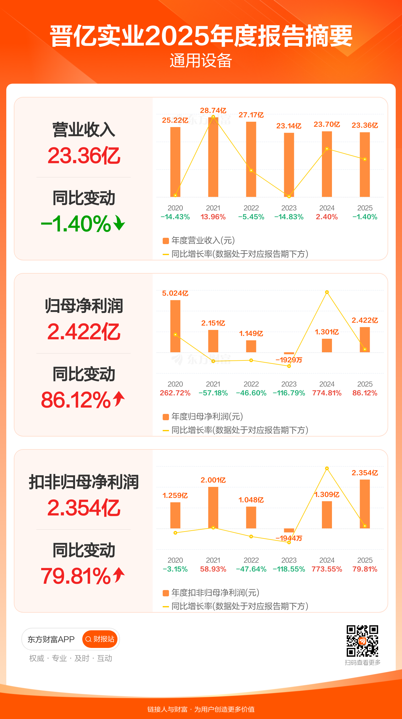 晋亿实业3月20日发布2025年年报显示,公司全年实现营业收入23.36亿元,同比下滑1.40%;归母净利润2.42亿元,同比增长86.12%;扣非归母净利润2.35亿元,同比增长79.81%。