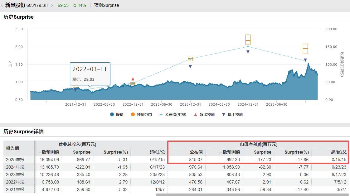 按照年报披露的数据来看,新泉股份2025年出现“增收不增利”的情况。另据Wind金融汇编的数据,15家机构对新泉股份2025年归母净利润的一致预测值为9.923亿元,因此按照公司披露的8.15亿元的数据来看,是不及预期的(-17.86%),且低于所有15家机构给出的预测值。