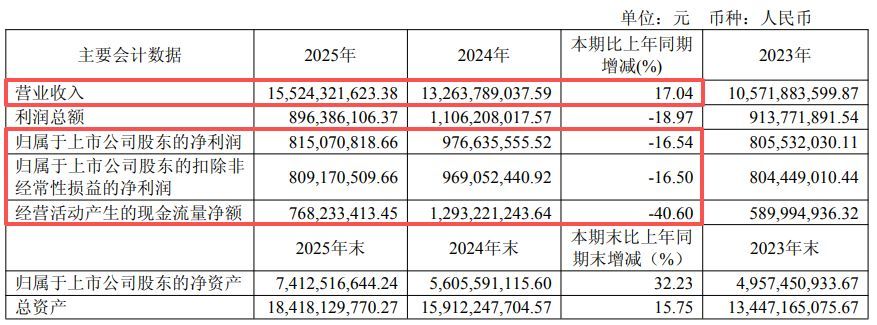 3月19日晚间,新泉股份披露2025年年报,公司2025年实现营收155.24亿元,同比增长17.04%;实现归母净利润8.15亿元,同比下滑16.54%;实现扣非净利润8.09亿元,同比下滑16.5%;基本每股收益1.66元,同比下滑17%。公司向全体股东每10股派发现金股利3元(含税),剩余未分配利润结转以后年度,以资本公积金转增股本,每10股转增4股,不送红股。