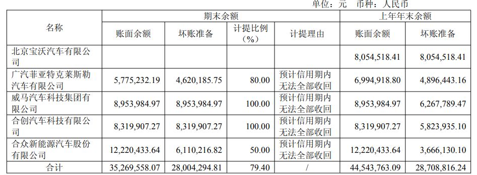 此外,随着汽车行业“淘汰赛”加剧,部分车企经营困难波及了公司的应收账款。年报显示,新泉股份对广汽菲亚特克莱斯勒、威马汽车、合创汽车、合众新能源等多家车企单项计提了坏账准备。这部分应收账款账面余额合计达3526.96万元,实际计提坏账准备合计达2800.43万元,计提理由均为“预计信用期内无法全部收回”。这反映了下游行业洗牌对供应链企业造成的直接财务冲击。
