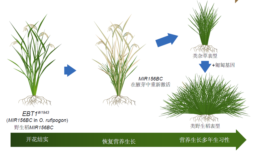 除了破解进化谜题,研究团队还在国际上首次发现并克隆多年生野生稻的生长基因,并命名为“Endless Branches and Tillers 1”(EBT1),意为“无尽的分枝与分蘖”。EBT1基因的突变是导致水稻由多年生“长寿”植物变为一年生“短命”植物的关键。