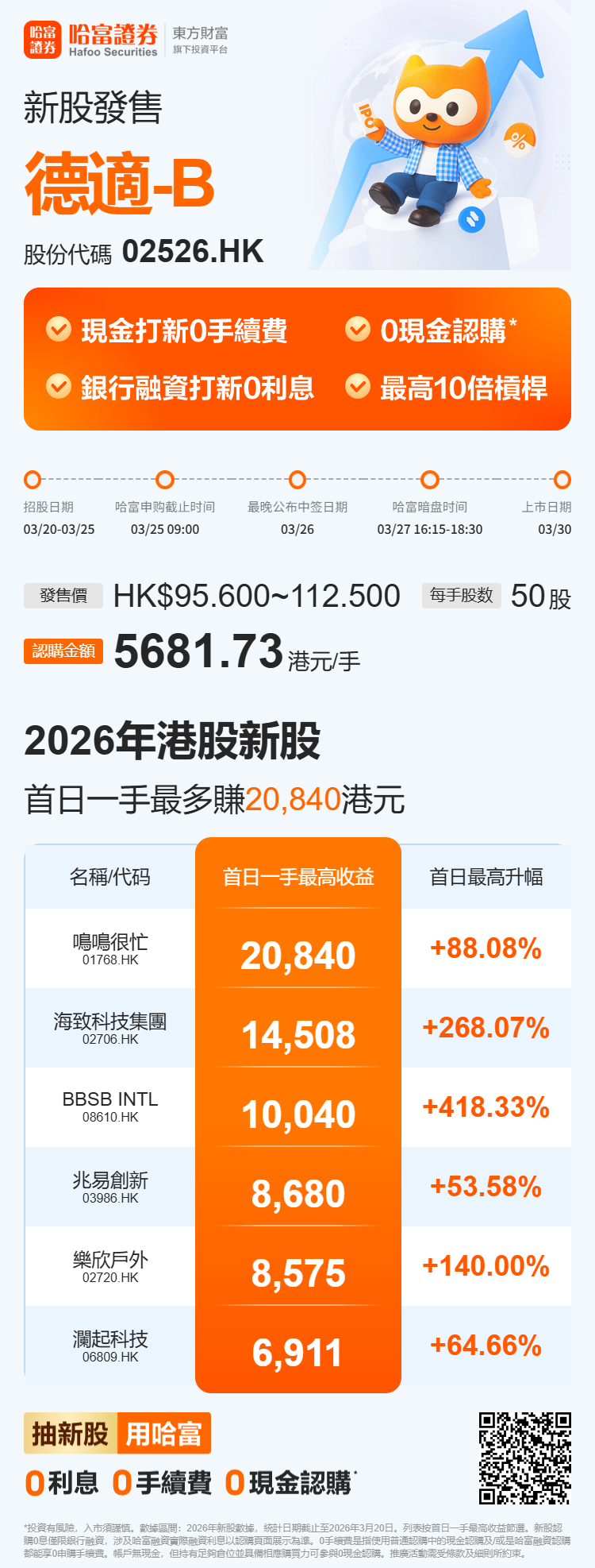 德适-B(02526)2026年3月20日-2026年3月25日招股,拟全球发售799.92万股H股,其中香港发售占约10%,国际发售占约90%;发售价每股95.6-112.5港元。每手50股H股,一手入场费5681.73港元,预期H股将于2026年3月30日(星期一)上午九时正开始在联交所买卖。