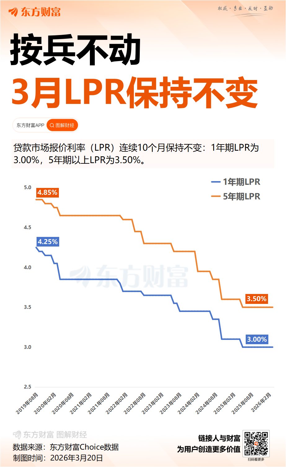 中国人民银行授权全国银行间同业拆借中心公布,2026年3月20日,贷款市场报价利率(LPR)为:1年期LPR为3.00%,5年期以上LPR为3.50%,均较上月保持不变,以上LPR在下一次发布LPR之前有效。