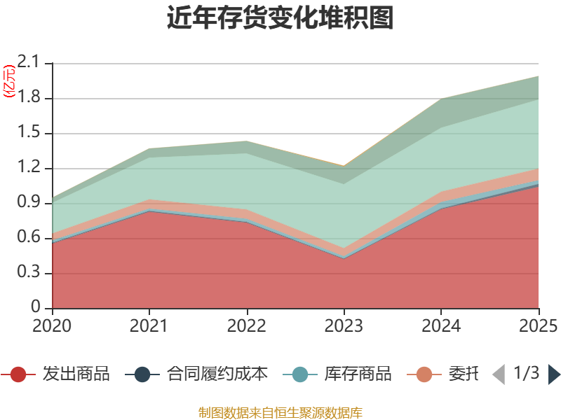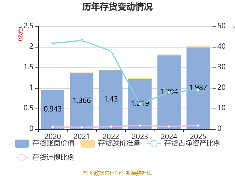 从存货变动来看,截至2025年末,公司存货账面价值为1.99亿元,占净资产的19.06%,较上年末增加1929.36万元。其中,存货跌价准备为343.76万元,计提比例为1.7%。