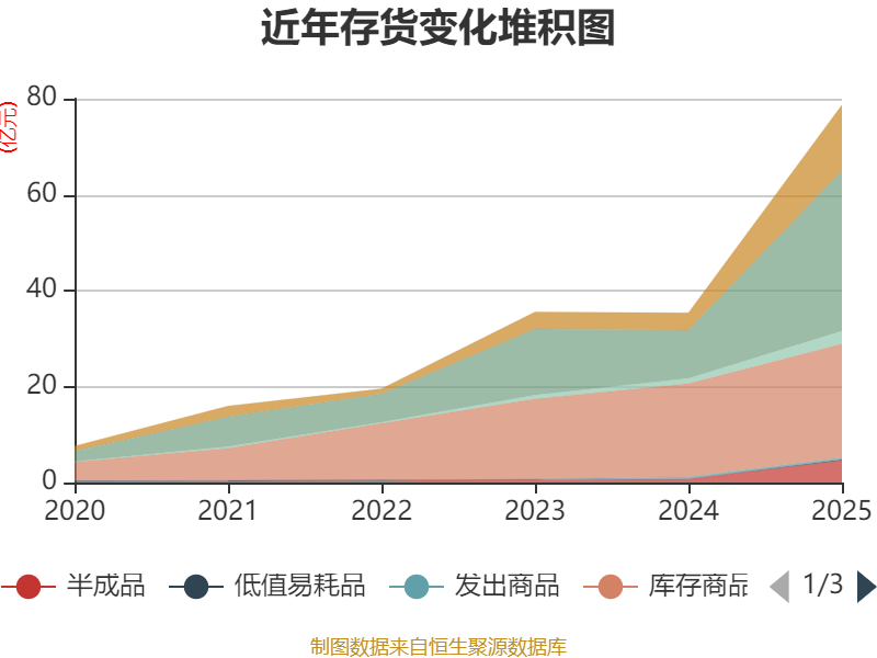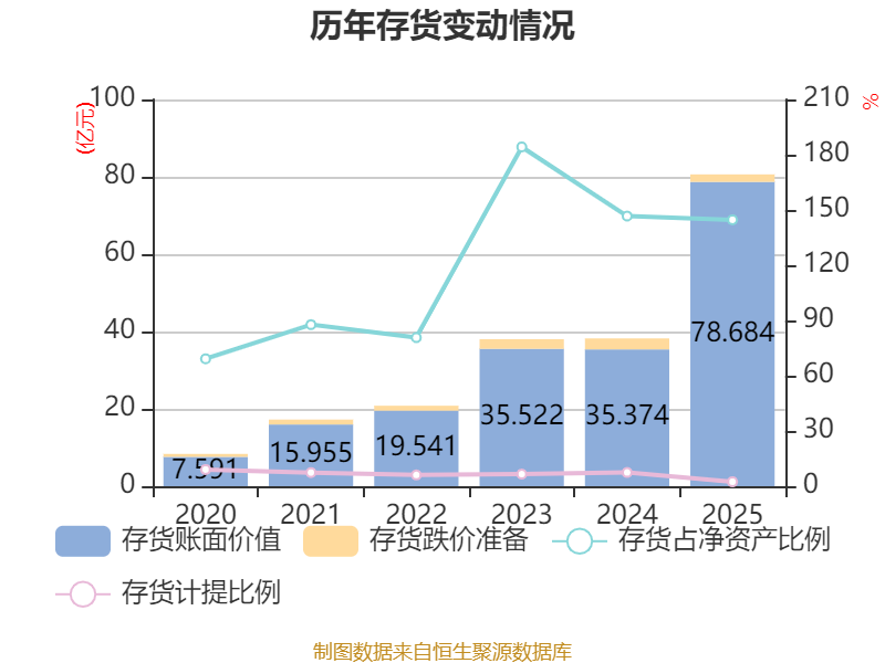 从存货变动来看,截至2025年末,公司存货账面价值为78.68亿元,占净资产的144.63%,较上年末增加43.31亿元。其中,存货跌价准备为1.94亿元,计提比例为2.4%。