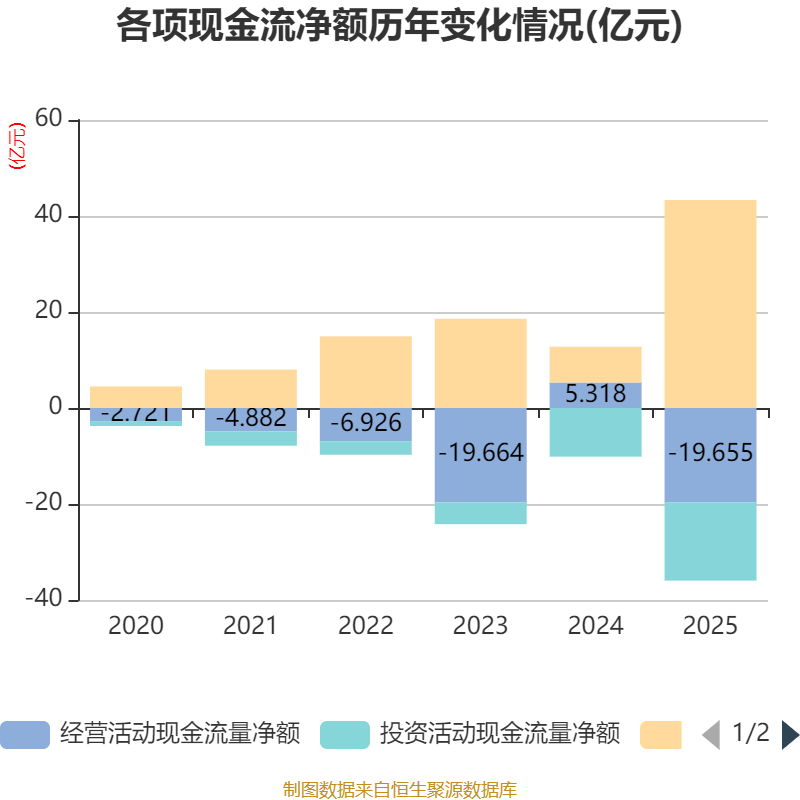 截至2025年,公司经营活动现金流净额为-19.65亿元,同比减少24.97亿元;筹资活动现金流净额43.33亿元,同比增加35.88亿元;投资活动现金流净额-16.31亿元,上年同期为-10.14亿元。