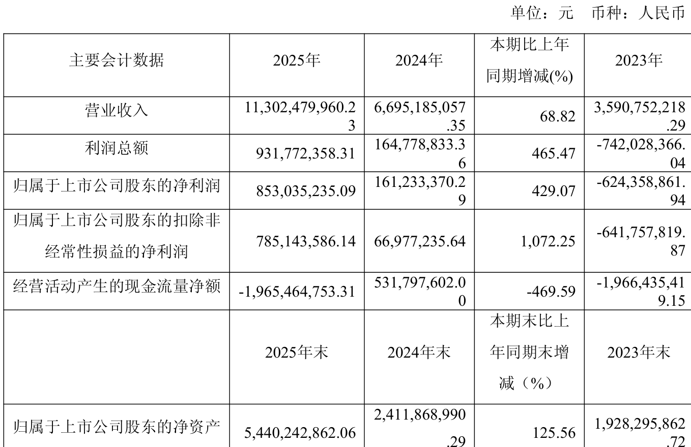 中证智能财讯佰维存储(688525)3月20日披露2025年年度报告。2025年,公司实现营业总收入113.02亿元,同比增长68.82%;归母净利润8.53亿元,同比增长429.07%;扣非净利润7.85亿元,同比增长1072.25%;经营活动产生的现金流量净额为-19.65亿元,上年同期为5.32亿元;报告期内,佰维存储基本每股收益为1.87元,加权平均净资产收益率为19.78%。公司2025年度分配预案为:拟向全体股东每10股派现2.141元(含税)。