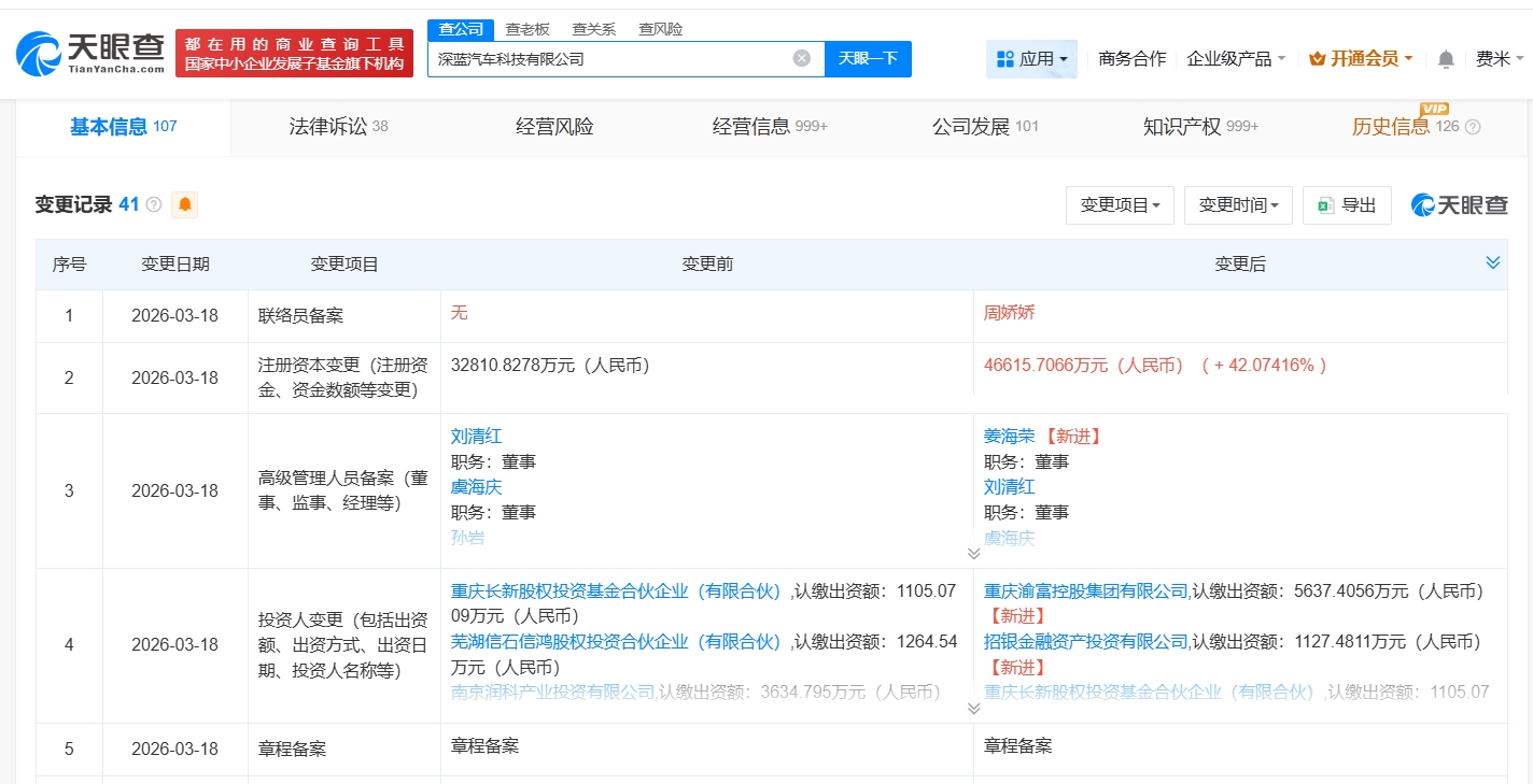 南方财经3月20日电,天眼查工商信息显示,近日,深蓝汽车科技有限公司发生工商变更,新增重庆渝富控股集团有限公司、招银金融资产投资有限公司为股东,注册资本由约3.3亿人民币增至约4.7亿人民币,增幅约42%。深蓝汽车科技有限公司成立于2018年5月,法定代表人为邓承浩,经营范围包括新能源汽车整车及汽车零部件的研发、生产、加工、销售和咨询服务等。股东信息显示,该公司由长安汽车(000625)、南京润科产业投资有限公司及上述新增股东等共同持股。