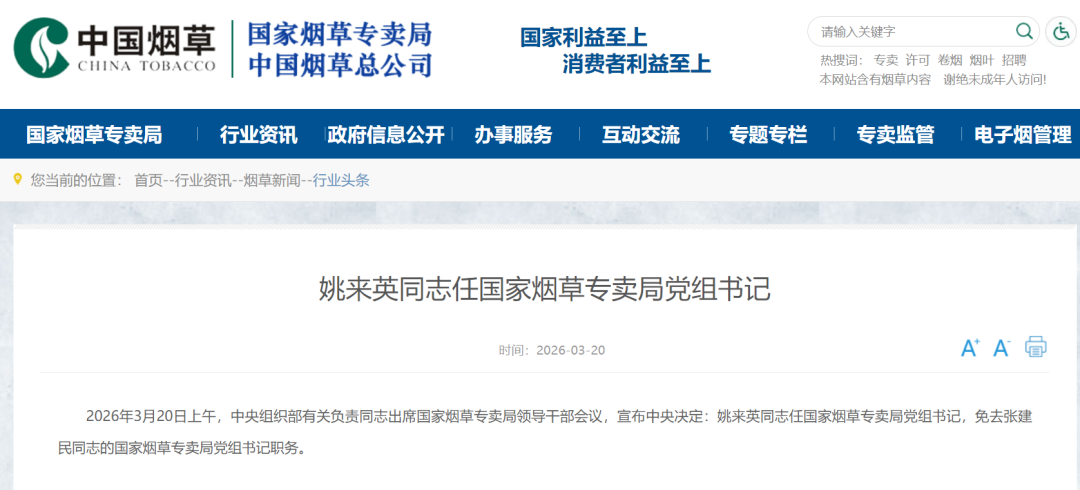 据国家烟草局官网消息,2026年3月20日上午,中央组织部有关负责同志出席国家烟草专卖局领导干部会议,宣布中央决定:姚来英同志任国家烟草专卖局党组书记,免去张建民同志的国家烟草专卖局党组书记职务。