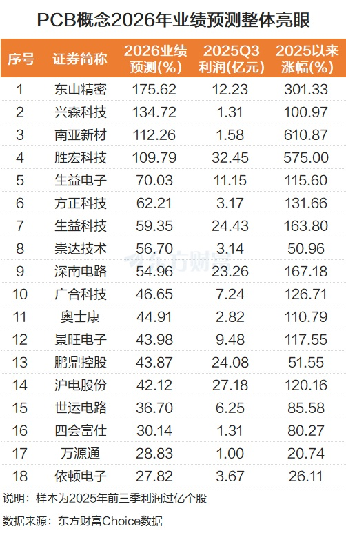 在行业高景气下,机构对于PCB板块的业绩整体乐观。以2025年前三季归母净利润过亿个股为样本,东方财富Choice数据显示,有18股机构预测2026年业绩同比增幅超20%。