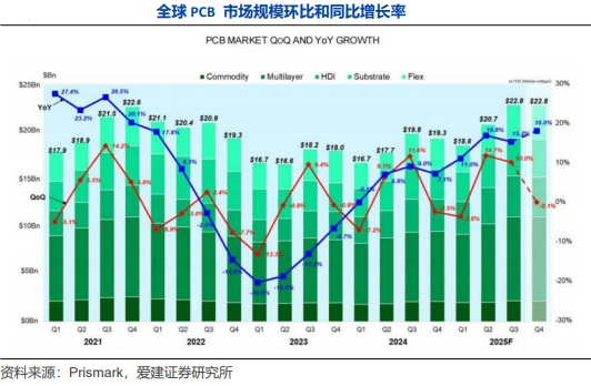 PCB板块的持续走强,在于AI产业爆发,带动全球PCB市场持续回暖。根据Prismark,2025 年全球PCB市场规模达849亿美元,同比增长15.4%;其中四季度市场规模228亿美元,同比增长18%,增长动能持续强化。