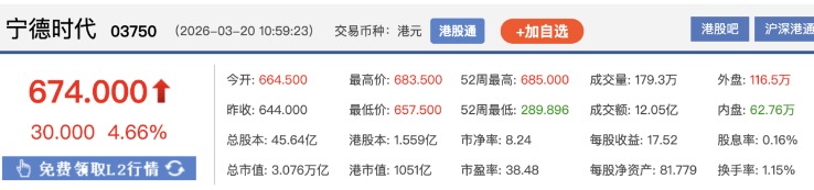 3月20日,宁德时代H股高开高走,一度涨超6%,最高价报683.5港元/股。截至10时59分,宁德时代H股报674港元/股,涨4.66%,成交额约12.05亿港元,总市值约3.08万亿港元;宁德时代A股涨3.77%。