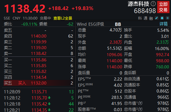 光模块、光芯片走强。源杰科技20%涨停,股价突破1100元大关,续创历史新高,成为A股新晋“千元股”,市值逼近千亿元。铭普光磁2连板,不过随后打开涨停板。长光华芯涨近17%,中际旭创、新易盛、德科立等纷纷大涨。