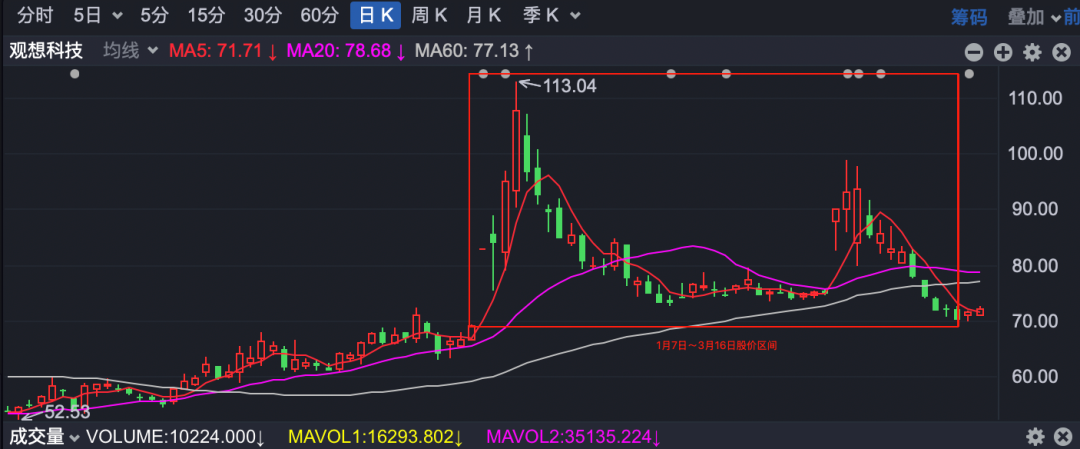 但好景不长,随后观想科技的股价逐步震荡回落,并于3月16日跌近70元关口,总市值缩水至56亿元,较1月中旬高点回落近四成。