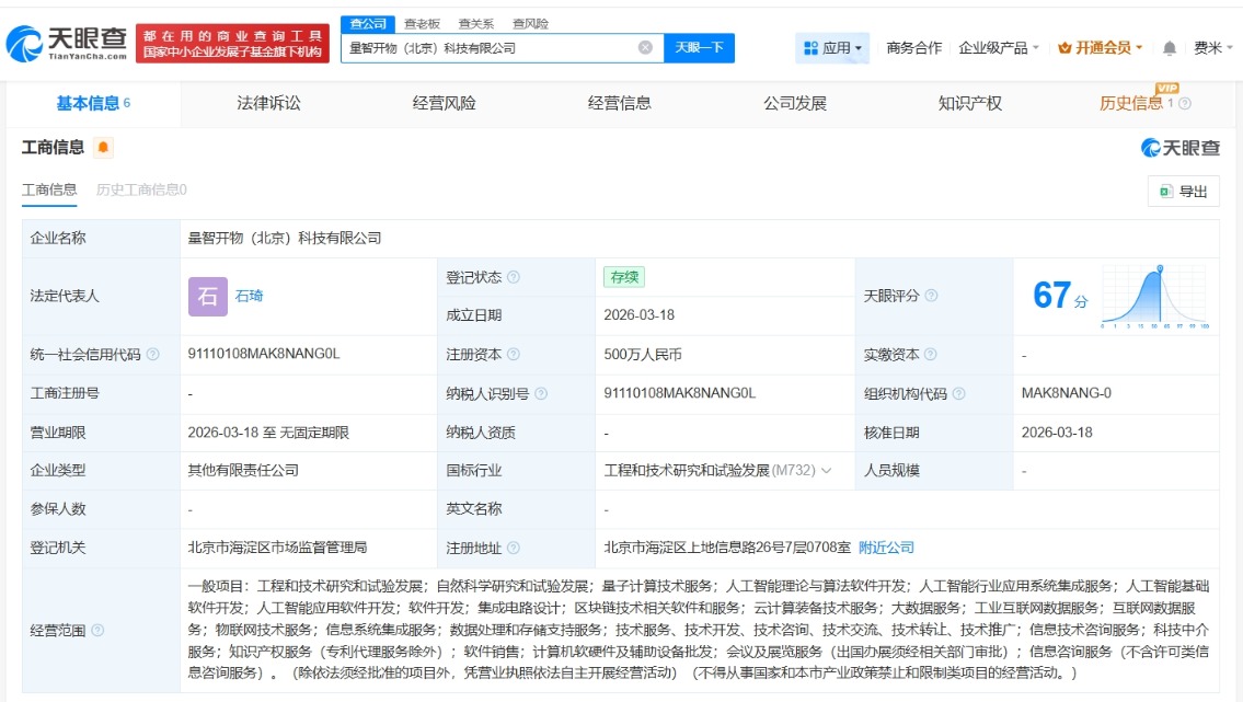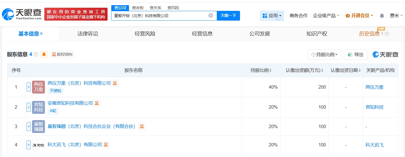 每经AI快讯,天眼查App显示,近日,量智开物(北京)科技有限公司成立,法定代表人为石琦,注册资本500万元人民币,经营范围含量子计算技术服务、人工智能理论与算法软件开发、人工智能行业应用系统集成服务等。股东信息显示,该公司由两仪万象(北京)科技有限公司、科大讯飞(北京)有限公司、安徽言知科技有限公司、量智臻融(北京)科技合伙企业(有限合伙)共同持股。