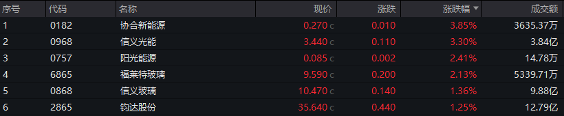 光伏太阳能概念部分上涨,协合新能源涨超3%,阳光能源、钧达股份等跟涨。