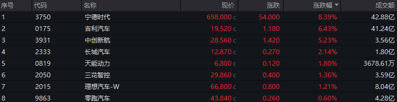 新能源车概念股上涨,吉利汽车涨超5%,长城汽车、比亚迪电子、理想汽车-W等跟涨。