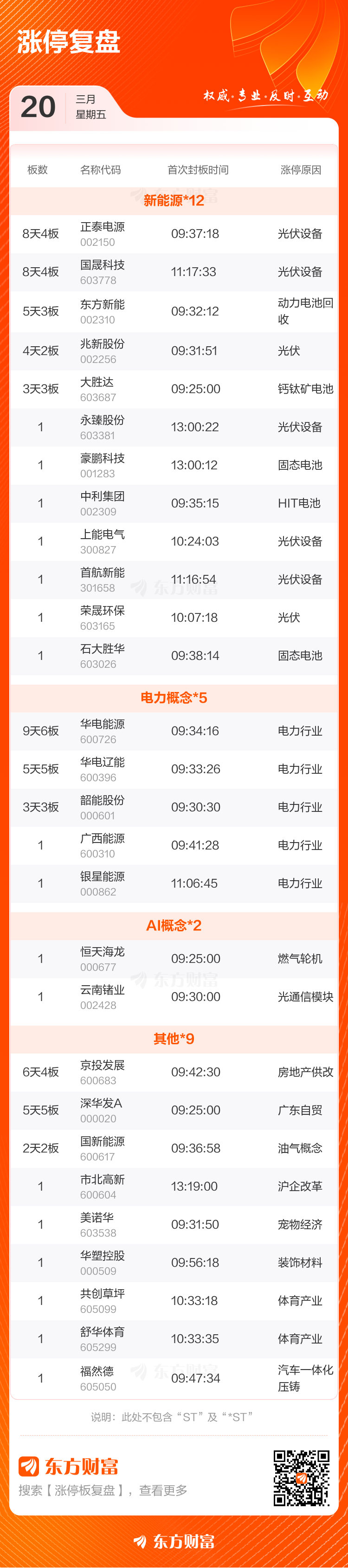 3月20日涨停复盘:39只股涨停 正泰电源8天4板