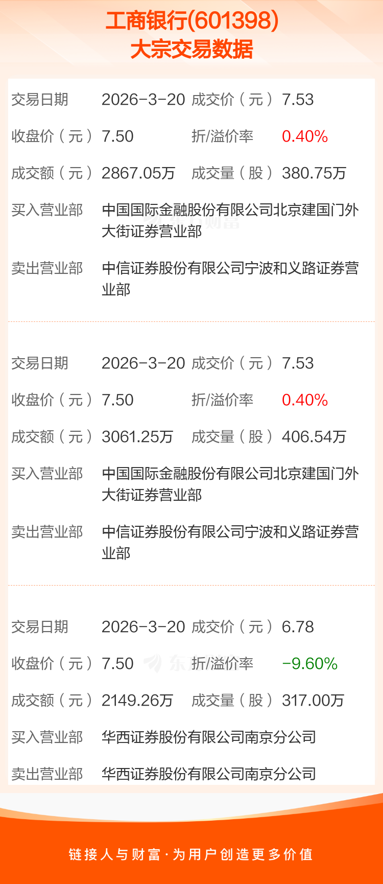 2026年3月20日,工商银行发生3笔大宗交易,共成交1104.29万股,成交金额8077.56万元。