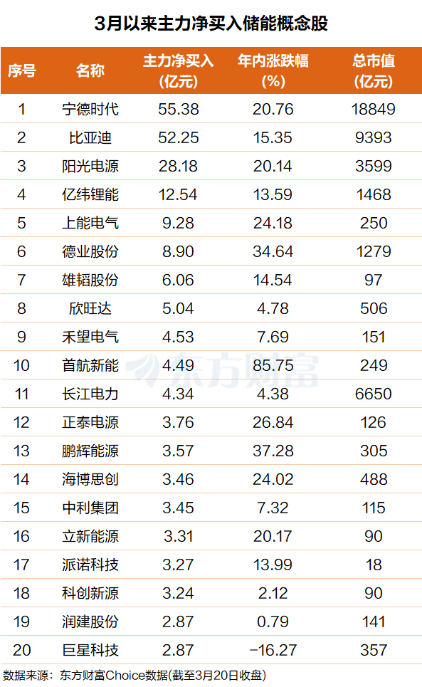 东方财富Choice数据显示,自今年3月以来,主力资金抢筹了一批储能概念股,其中宁德时代排名第一,主力净买入55.38亿元;比亚迪排名第二,主力净买入55.25亿元。