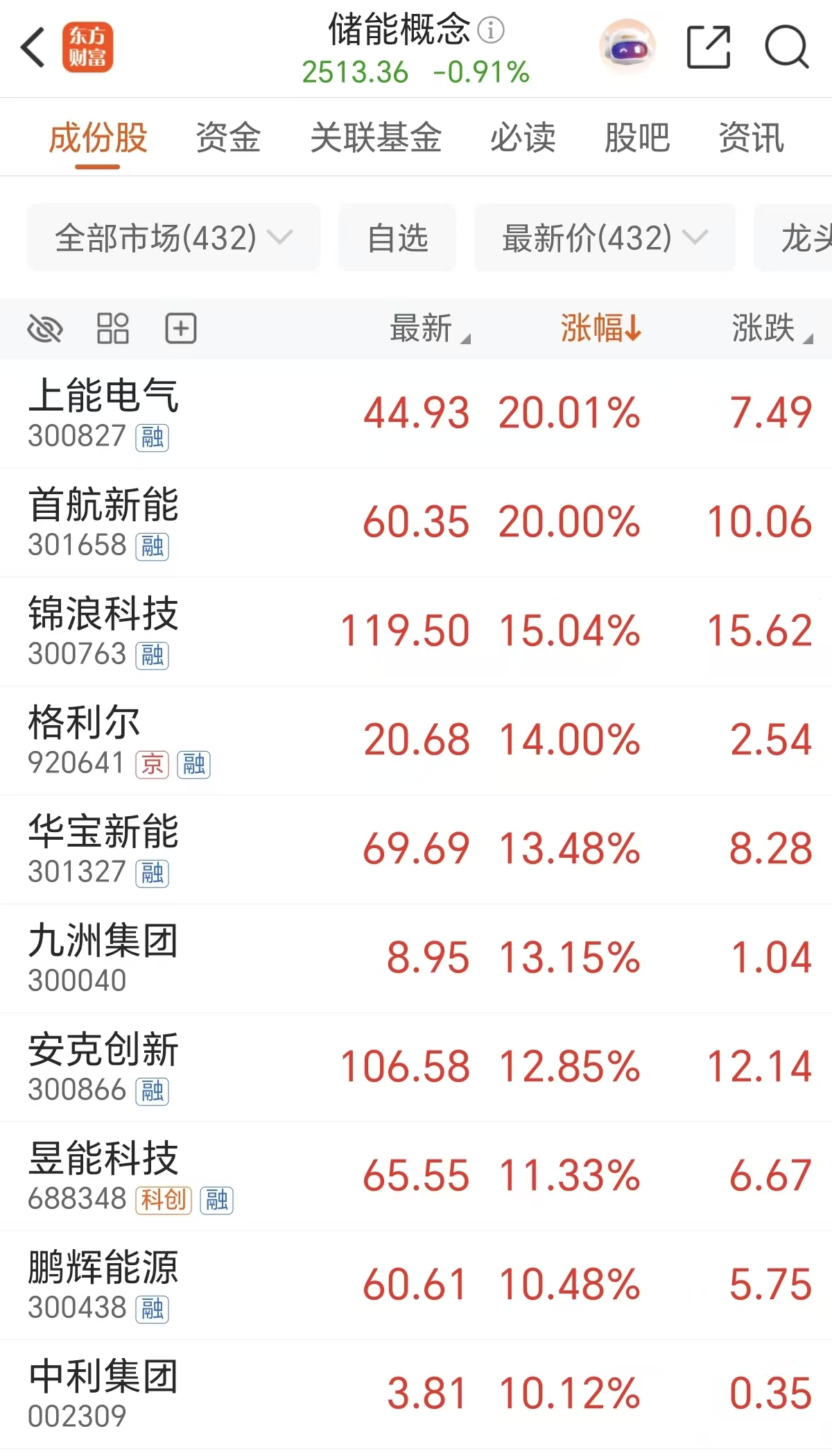 周五储能概念股部分活跃,上能电气、首航新能等20CM涨停,锦浪科技、格利尔等涨超10%。
