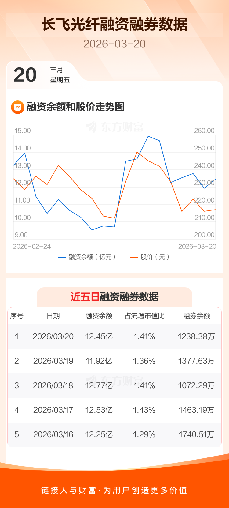 交易所最新数据显示,长飞光纤于2026年3月20日获融资买入3.82亿元,融资偿还3.29亿元,当日融资净买入5297.04万元。目前,该股融资余额12.45亿,占流通市值比例为1.41%。