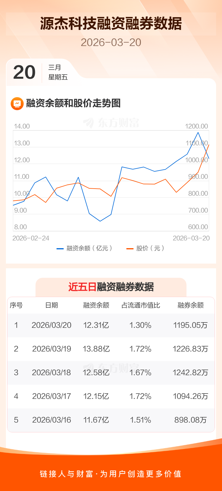 交易所最新数据显示,源杰科技于2026年3月20日获融资买入5.37亿元,融资偿还6.94亿元,当日融资净偿还1.57亿元。目前,该股融资余额12.31亿,占流通市值比例为1.30%。