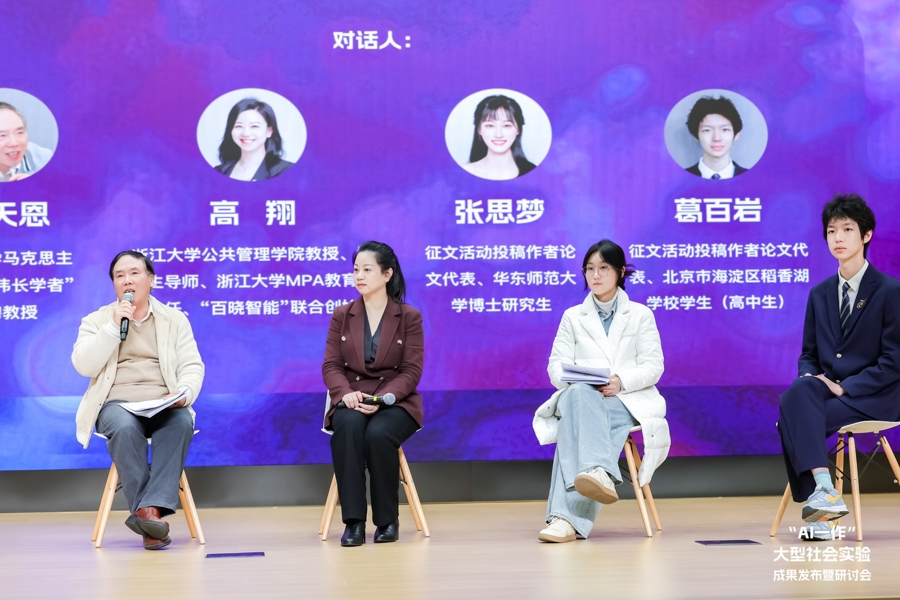 在圆桌对话环节,“人类作者”分享了人机共创的体验。北京市海淀区稻香湖学校高二学生葛百岩介绍了其团队关于“AI在中学跨学科课堂中作用”的研究,坦言AI帮助他简化学术文献、完成数据分析,但也发现一半受访者对“AI是否帮助理解”持不确定态度,推测这源于“许多高中生仍不会使用AI”,呼吁“老师要教会学生如何使用这个强大的工具”。作为AI时代的“原住民”,他已感受AI已渗透学习生活方方面面,并且养成了在大模型之间交叉验证信息的习惯。
