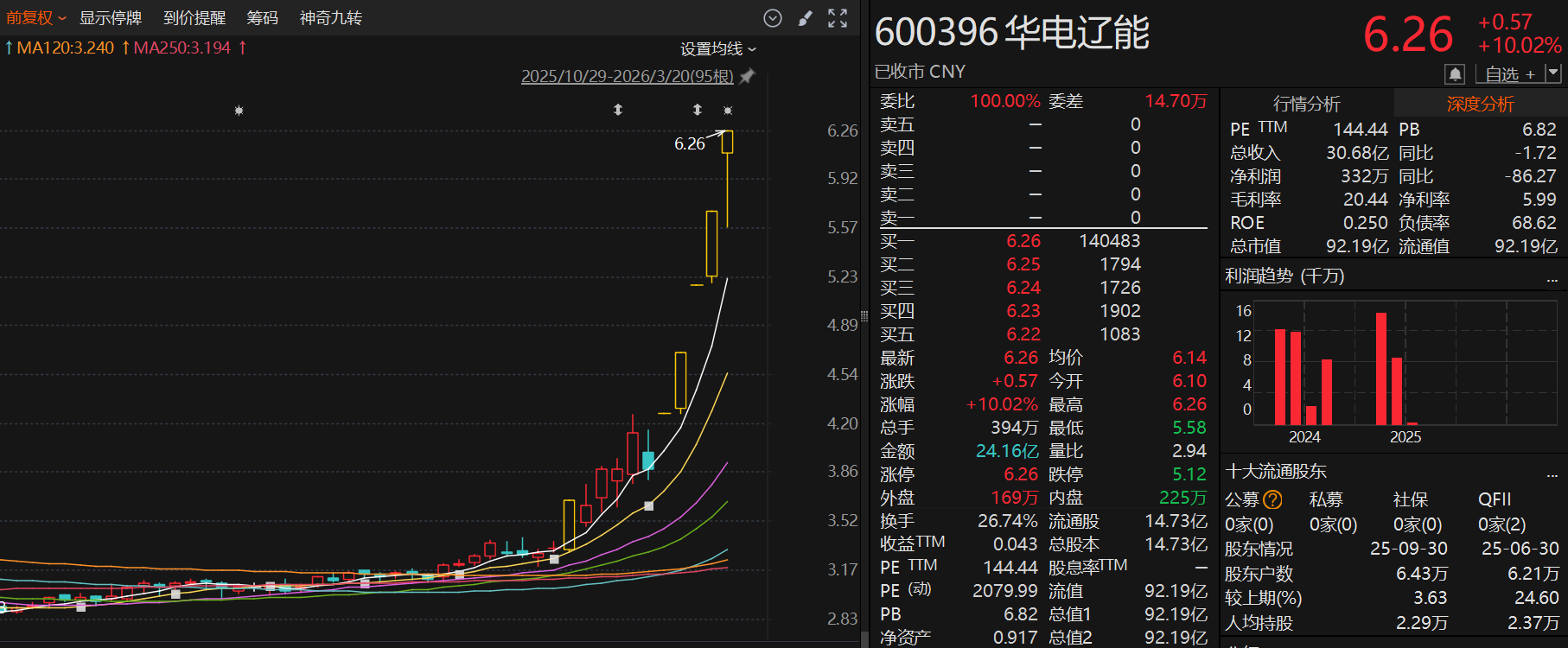 华电辽能股价从3月16日开盘的4.27元一路攀升至3月20日收盘的6.26元,累计涨幅达61.34%,股价创近期新高,总市值同步抬升至92.19亿。其中3月16日、18日、17日更是以一字板封死涨停。