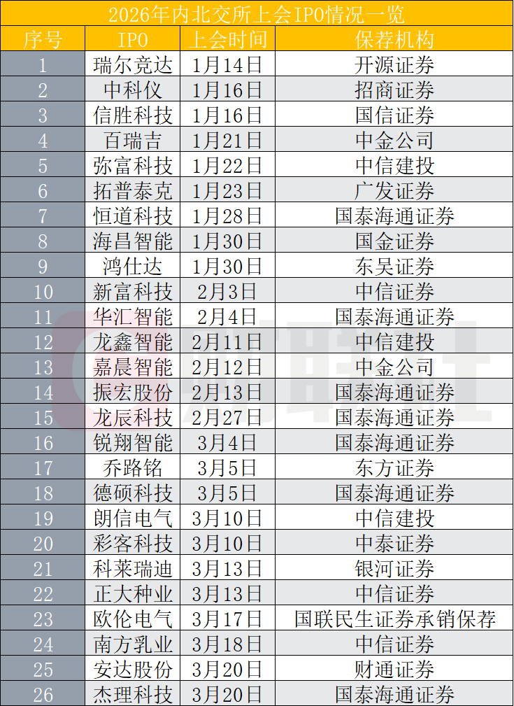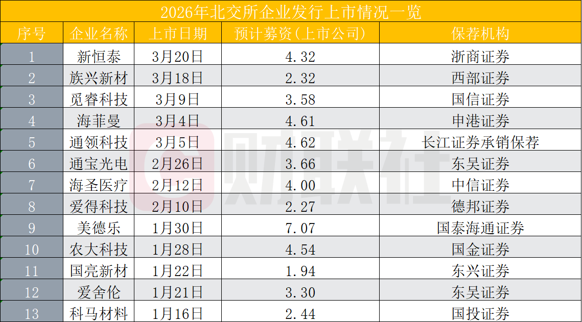 2026年以来,目前北交所已有13家企业成功发行上市,其中最新挂牌的是由浙商证券保荐的新恒泰。