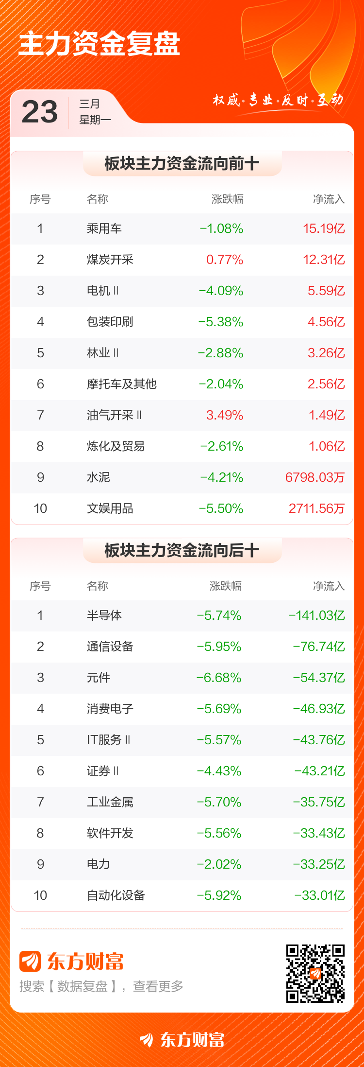 3月23日,沪指跌3.63%,深成指跌3.76%,创业板指跌3.49%。两市成交额2.43万亿,较上个交易日放量1447亿。数据显示,今日大盘主力资金净流出1253.99亿。乘用车、煤炭开采、电机Ⅱ等板块主力资金流入排名居前,其中乘用车净流入15.19亿元。