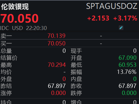 【大河财立方消息】3月23日,现货白银延续上涨趋势,重回70美元上方,现报70.05美元/盎司,涨3.17%;现货黄金微涨0.02%,现报4492.70美元/盎司。