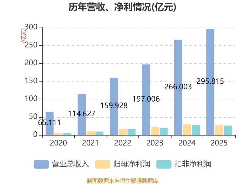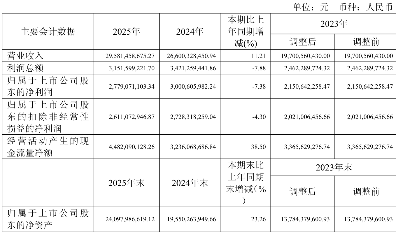 中证智能财讯拓普集团(601689)3月24日披露2025年年度报告。2025年,公司实现营业总收入295.81亿元,同比增长11.21%;归母净利润27.79亿元,同比下降7.38%;扣非净利润26.11亿元,同比下降4.30%;经营活动产生的现金流量净额为44.82亿元,同比增长38.50%;报告期内,拓普集团基本每股收益为1.61元,加权平均净资产收益率为12.37%。公司2025年度分配预案为:拟向全体股东每10股派现4.90元(含税)。