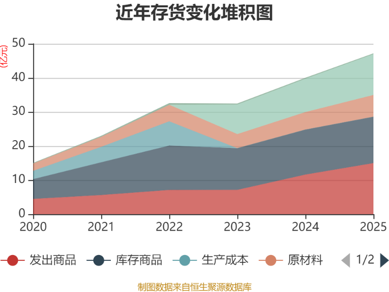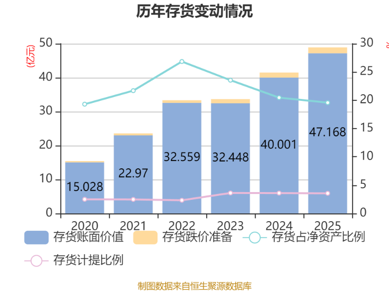 从存货变动来看,截至2025年末,公司存货账面价值为47.17亿元,占净资产的19.57%,较上年末增加7.17亿元。其中,存货跌价准备为1.73亿元,计提比例为3.55%。