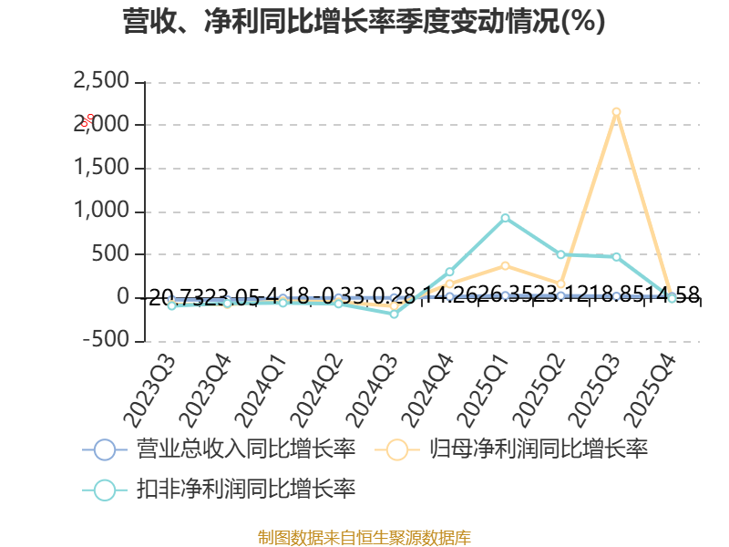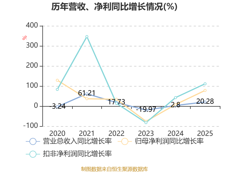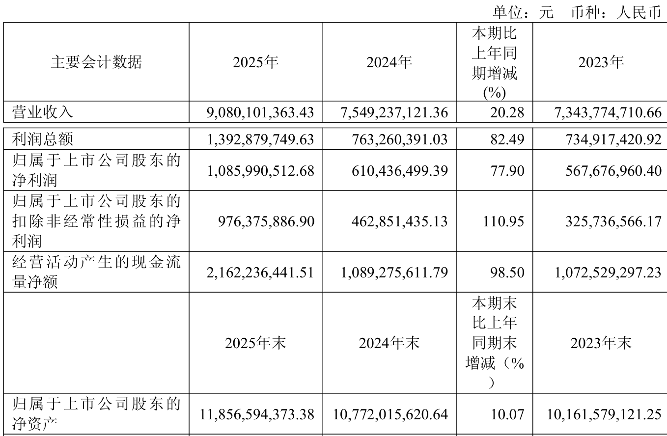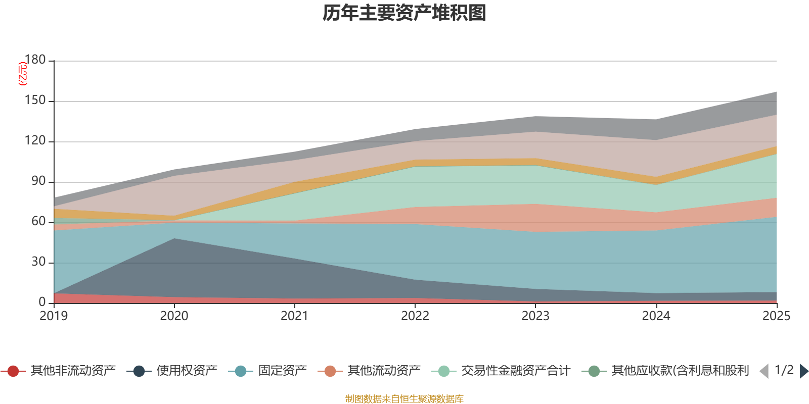 资产重大变化方面,截至2025年末,公司交易性金融资产合计较上年末增加60.28%,占公司总资产比重上升5.85个百分点;货币资金较上年末减少14.15%,占公司总资产比重下降5.07个百分点;固定资产较上年末增加20.03%,占公司总资产比重上升1.5个百分点;一年内到期的非流动资产较上年末减少50.04%,占公司总资产比重下降1.35个百分点。