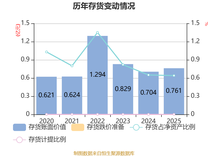 从存货变动来看,截至2025年末,公司存货账面价值为7605.76万元,占净资产的0.64%,较上年末增加567.56万元。公司本期没有计提存货跌价准备。