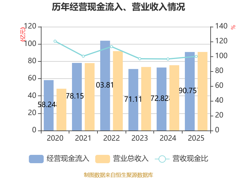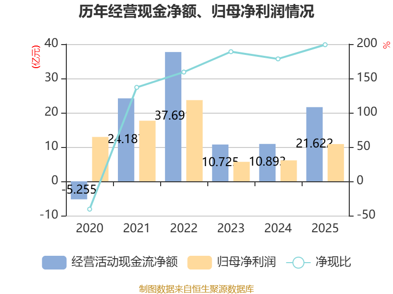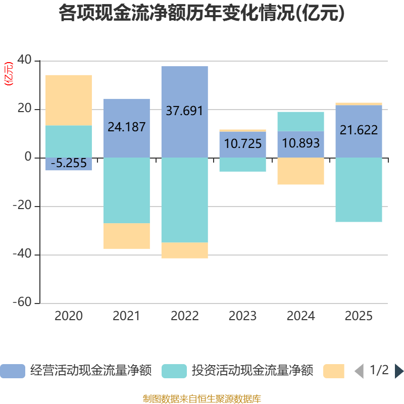 截至2025年,公司经营活动现金流净额为21.62亿元,同比增长98.5%;筹资活动现金流净额9941.61万元,同比增加12.12亿元;投资活动现金流净额-26.56亿元,上年同期为7.93亿元。
