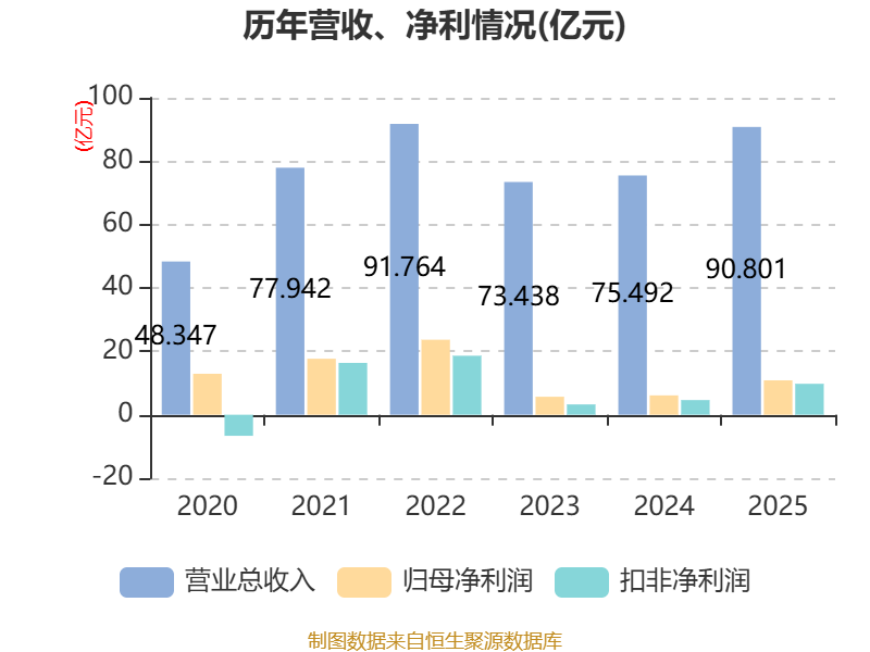 中证智能财讯安通控股(600179)3月24日披露2025年年度报告。2025年,公司实现营业总收入90.80亿元,同比增长20.28%;归母净利润10.86亿元,同比增长77.90%;扣非净利润9.76亿元,同比增长110.95%;经营活动产生的现金流量净额为21.62亿元,同比增长98.50%;报告期内,安通控股基本每股收益为0.2566元,加权平均净资产收益率为9.60%。