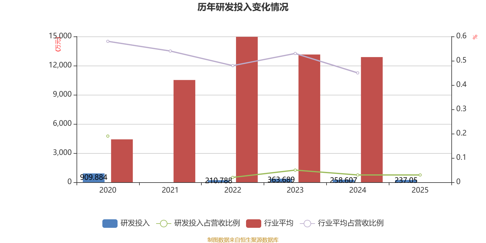 2025年全年,公司研发投入金额为237.05万元,同比下降8.34%;研发投入占营业收入比例为0.03%,相比上年同期持平。此外,公司全年研发投入资本化率为0%。