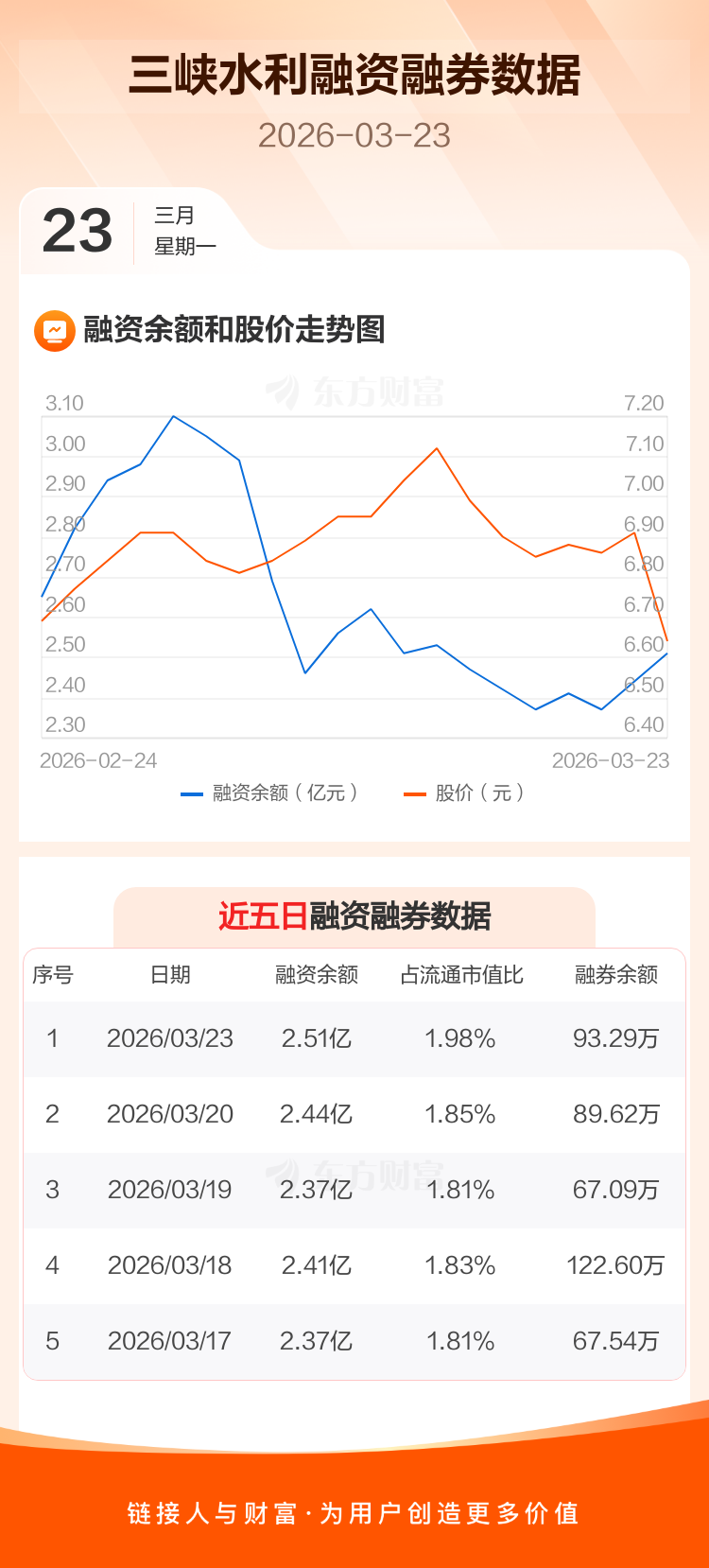 交易所最新数据显示,三峡水利于2026年3月23日获融资买入2675.72万元,融资偿还1994.74万元,当日融资净买入680.98万元。目前,该股融资余额2.51亿,占流通市值比例为1.98%。