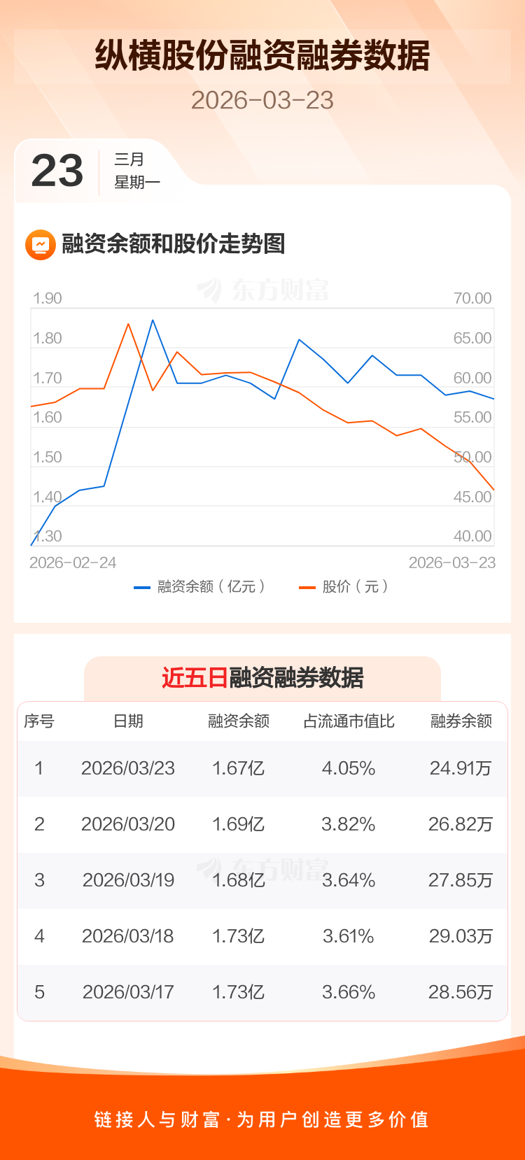 交易所最新数据显示,纵横股份于2026年3月23日获融资买入1163.58万元,融资偿还1424.27万元,当日融资净偿还260.7万元。目前,该股融资余额1.67亿,占流通市值比例为4.05%。