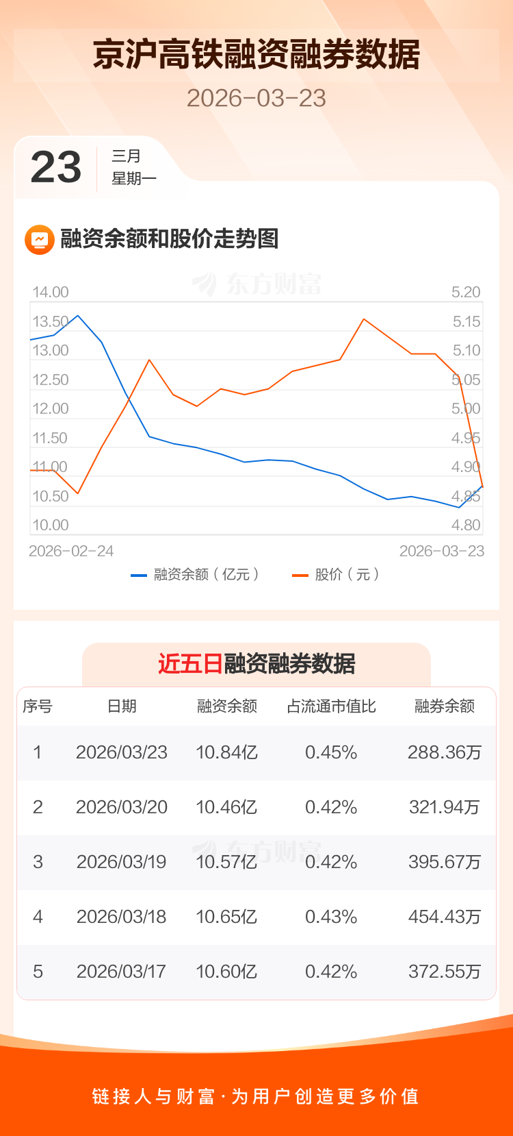 交易所最新数据显示,京沪高铁于2026年3月23日获融资买入1.02亿元,融资偿还6448.35万元,当日融资净买入3712.34万元。目前,该股融资余额10.84亿,占流通市值比例为0.45%。