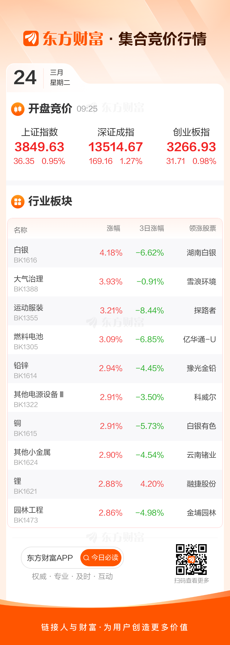 3月24日,三大指数集体高开,上证指数高开0.95%,深证成指高开1.27%,创业板指高开0.98%。板块方面,白银领涨,湖南白银涨4.94%,大气治理、运动服装等开盘涨幅居前。