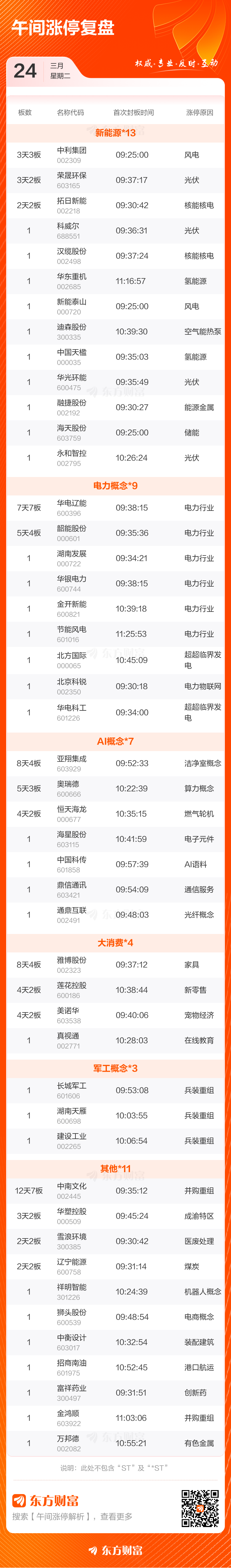 3月24日午间涨停复盘:58股涨停 中利集团3天3板