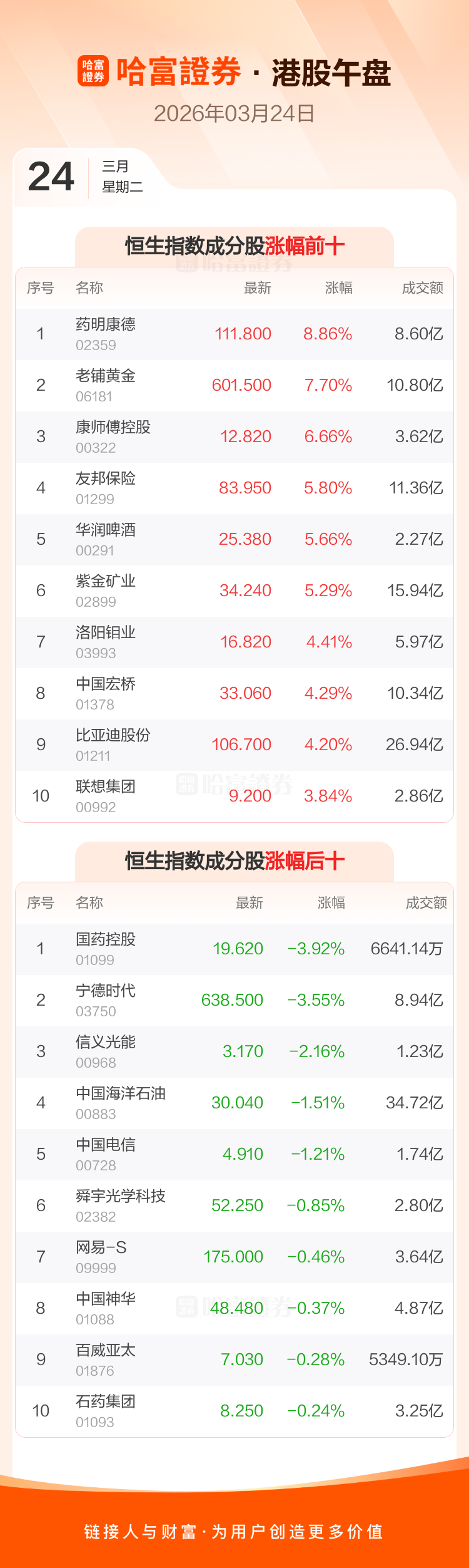 港股3月24日午盘走高,恒生指数收报24829.92点,涨447.45点,涨幅1.84%;恒生科技指数收报4779.52点,涨67.04点,涨幅1.42%。恒生指数成分股中药明康德、老铺黄金、康师傅控股涨幅居前,国药控股、宁德时代、信义光能跌幅靠前。恒生科技指数成分股中比亚迪股份、联想集团、蔚来-SW涨幅居前,地平线机器人-W、腾讯音乐-SW、金山软件跌幅靠前。